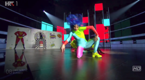 We first meet Demenica swinging a ribbon, and hopping from stone to stone. On stage, she wears a very short white and pink tutu skirt. Her two side-vocals wear outfits identical to hers. The show producers seem to be following a rule against abandoning the Croatian music style for more than one song at a time; as that’s where we’re back at.