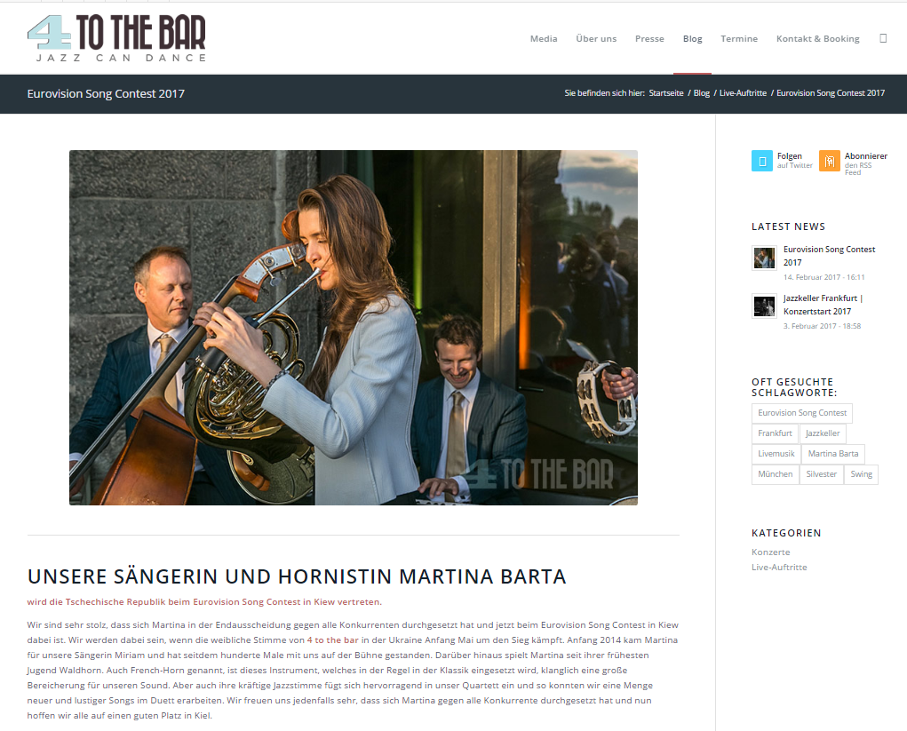 Just as fans were speculating and came up with Martina Bárta’s name, the Jazz singers German band 4 to the bar posted on their website that it is indeed true. They wrote that they are proud that their singer and hornist since early 2014 has been chosen for the Eurovision Song Contest. Few hours later, they removed the post – maybe as the Czech broadcaster told them, that they themselves hadn’t released the news, but the screenshot below shows their post.