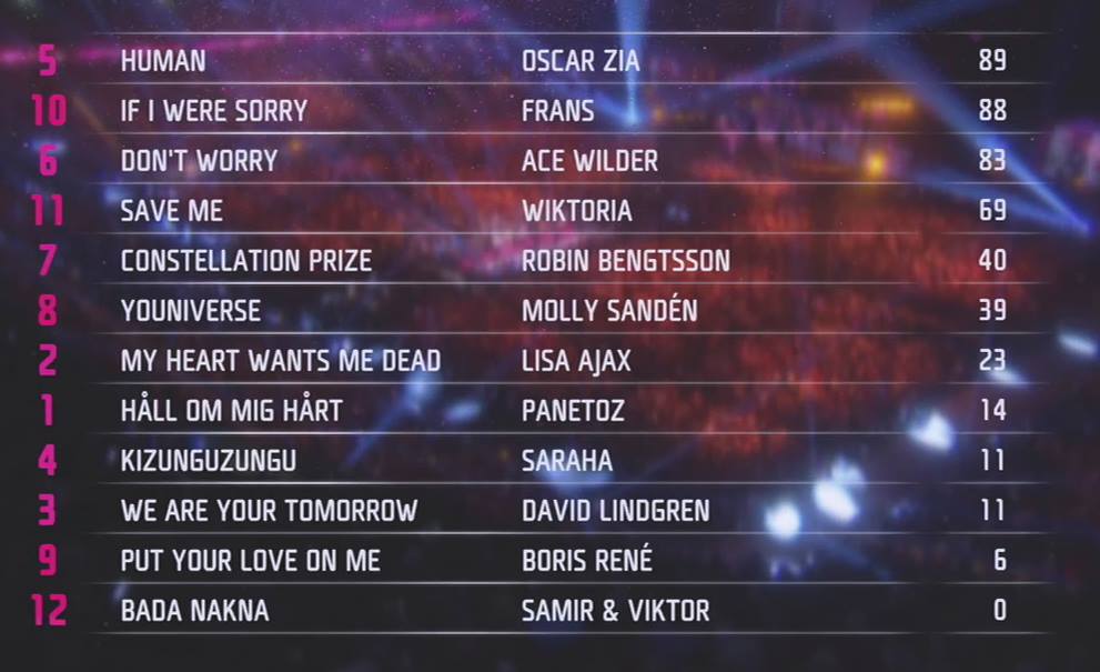 Four regular heats and a second chance round, that’s what we have been through so far in Sweden in order to get to the final held tonight. They started out being 28 acts, a disqualification narrowed them down to 27 before the first heat even kicked off and tonight 12 were left for the big final.