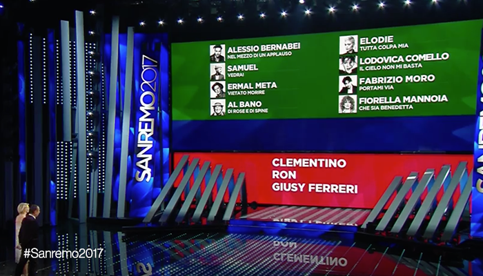 The show was introduced by a short video which gave a review on past Sanremo highlights, presenting important milestones of the competition without presenting the winning songs of past Sanremo editions. Then, the participants of this year’s contest presented themselves and talked about their aims, their music and Sanremo within a short video.