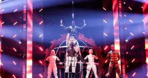 The music just bursts out and fills the stage, and if you can call it vocals, they are all more in tune. The dancers are on point and it’s hard to imagine that this won’t make the final. The bondage is all over the stage and we are all going to start wearing it in the press centre.