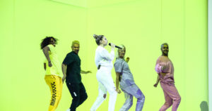 Like a chameleon the stage changes colour every five seconds, It is hard to keep up with it all. In the second verse a jungle appears and Michela is lost in the trees. The dancers are clearly enjoying the ride and end up in a purple city. The perfromance ends in an array of colours. Hard to catch it all.