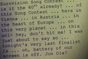 The script which is quite long, and likely to be shortended, shows the hosts dragging the tension by not immidiately revealing that Iceland (or someone else) is the last country to qualify for the final – it also reveals that one of the hosts will hit anotherone, and that Executive Supervisor of the Eurovision Song Contest Jon Ola will be called as the battery on their screens run out.