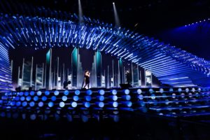 The song starts with a close shot of Václav singing to Marta, who is standing with her back turned at him on the other side of the stage. Václav is in a grey suit and Marta is wearing a short black dress that leaves one of her shoulders exposed. The stage is again lit in blue. We notice in the press centre that with the Czech Republic we get the performers dressed in black against a blue background and it feels as if they are really trying to distinguish themselves from the Norwegian duet that preceded them (the Norwegians wearing white outfits against a stage lit in orange). There are arrays of reflective slabs projected in the background that give the stage the impression of extra depth. A clouded night sky is reflected on the slabs as they rotate. The duo’s vocal performance is rather strong and consistent. On cannot help but think that it would be a shame if their vocal abilities were overlooked due to their physicality. Marta in particular is also very expressive facially while performing her lines. What is more, both singers look really happy to be performing on the Eurovision stage and it shows. At the pivotal ‘or we can rise and fight’ moment, Marta throws away her shoes – this might have been a good idea in theory but it looks quite messy on screen. It is also a shame that, right at the last run of the song, Václav’s voice cracks during the last big note – he recovers cleverly but perhaps, like Malta, he should look after his voice until the day of the semi-final. The Czech Republic brings thus brings the third day of rehearsals to a close.