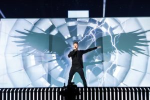 Everyone turns to face the monitor in the press centre when the time comes for Russia to get to the stage. And no one is disappointed with the beginning of the presentation. Sergey is lit from behind with his face being in darkness. There is a close up of him singing the line ‘You’re the only one’ and then we get a panoramic shot of the stage appearing to be star-lit. Soon a bright white panel appears seemingly out of nowhere. Sergey is standing in front of it, turns to one side and lowers his upper body as a long black wing seems to be growing from his shoulder, then turns to the other side and the same thing happens, then turns to face the camera with both black wings flickering behind him (people in the press centre are quick to point out similarities with the Icelandic entry this year and its presentation during the Icelandic national final). Male dancers dressed in black, just like Sergey himself, appear from behind the panel and carry out a dance routine before hiding behind it again. Sergey appears to be leaving traces of himsefl on the panel now in the form of abstract geometric multi-faceted formation. He soon starts to ascend. The panel has seemingly broken down into moving white boxes (both actual boxes and impressions of boxes) that protrude and recede from the plane of the panel. Sergey steps on the boxes to get higher and higher… and then the fall happens… No, not an intentional one, Sergey actually has a minor accident and the first run of the song stops abruptly. There is a small wait and the rehearsal starts again. Picking my description from where I left, the boxes turn into space matter that revolves around a seemingly floating Sergey because, yes, that’s where we are right now, space. The matter comes together to form rocks of ice (asteroids? we’re in space after all…) and the singer appears to jump from one to another. While this is going on, thick blue spotlights from behind the panel, add to the sense of depth of the stage. Sergey ends up on top of the main panel – additional (similar but taller) panels have appeared behind it and they are now all brightly yellow – Sergey has reached the sun – and, indeed, a star is displayed on the main panel before the yellow bright light goes and the presentation comes to end with a female figure being silhouetted on the panel and Sergey still on top of it.