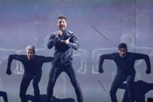 Standing against a backdrop screen, black wings appear behind him, first from the right and then the left. The stage has a stars in the sky type of appearance. After all the tricks and effects, a female backing singer appears while Sergey stands on top of a yellow box. A flame is held in her hand which eventually extinguishes while Sergey points the number one with his finger, looking pleased with himself, as well he should. Amazing.