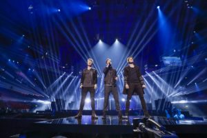 An array of red lights illuminated the stage floor while a video backdrop of Manuella’s eyes were shown. As the song progressed there were flashes of blue lights too as befits the song. The staging gave a impression of more X-Factor than Eurovision.