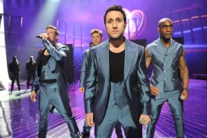 Duncan, Simon, Lee and Antony are all in shiny blue suits, all designed slightly differently. They have two male backing singers, both in dark suits. The back drop switches between white and vivid green.