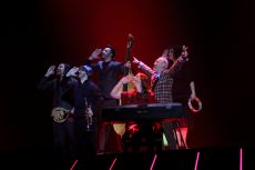 Dino wore again his multicoloured jacket. Will this also be the outfit for the semi-final? He starts the song screaming out for his love. The female backing singer is calling back which sounds like an echo. The backdrop is very original. It is mostly coloured in red showing a fairground and later on some hearts. With the first chorus they start with their simple dance choreography. Additionally a single dancer is dancing around the stage. At the end of the song Dino moves to his backing singers and they are all waving to the audience accompanied by pyrotechnics around them.