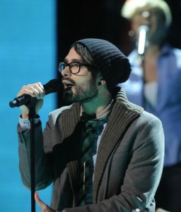 He is wearing grey jacket and dark shirt and also a wool hat. On stage there is also a male guitarist sitting on a stool and a girl backing vocalist. A soft rock song that the audience really like.
