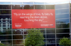 Another Danish/Norwegian thing is a big banner advertising for the airline Norwegian. The text says: "Fly on the wings of love, fly, baby, fly – reaching the stars above – touching the stars". As the Danes are here to win – 10 years after the Olsen Brothers won in Stockholm this is quite a fun thing to see twice every day as we passes it on the way from the hotel to the press centre and back.