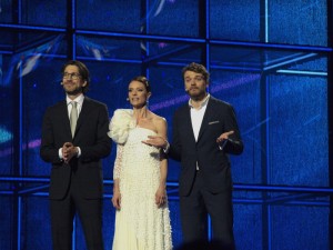 Nikolaj Koppel and Pilou Asbæk take the stage and together they say the re-owner phrase "Good evening Europe". Lise is clad in an elegant