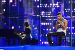 During the second verse, a male dancer appears from the left of the stage and approaches the pianist who leaves her piano as they both start dancing intensely in a routine whose sequences hint to domestic violence. András performance is strong, his face looks strained as he moves around the stage but this matches the anguish of the song’s lyrics. There is a mix of close and long camera shots, including an upside down panoramic zoom out. The stage remains bright red for the second chorus then turns blue for the finale when both dancers approach András; he lets the female dancer embrace him and, with a calm but firm gesture, pushes the male one away from her. This is a good performance and a well worked presentation.