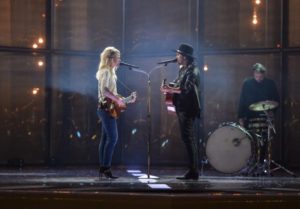 The presentation starts with an overhead camera shot of the Common Linnets facing each other standing on an impression of a moving road (a clear reference to the song’s ‘Driving in the fast lane’ opening line). They are both playing guitars and are surrounded by their musicians. Ilse is wearing a white woven top and what appears to be blue jeans whereas Waylon is in black, complete with a wide brimmed hat.