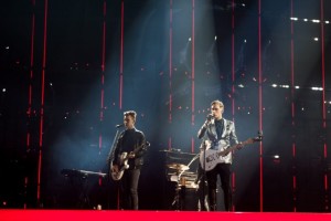 Lead singer Topi Latukka is wearing a silver jacket over a black shirt. He is very much the anti-performer, keeping his eyes closed and failing to connect with the camera for much of the rehearsal. Perhaps he too was blinded by the light? There were some fantastic close ups of Topi but these were mostly wasted due to his eyes being firmly shut most of the time. As the song picks up, the backdrop changes to a deep, dramatic red before rotating beams come into play, which look spectacular on screen.