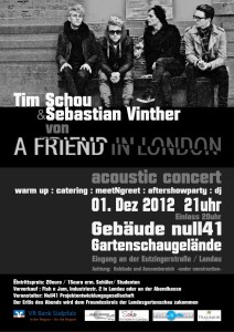 A few days ago fans in London could experience a small intimate concert by A Friend In London‘s Tim Schou and Sebastian Winther Olsen. The concert was arranged by a fan, something that is also the case for the gig in Landau, Germany on Saturday.