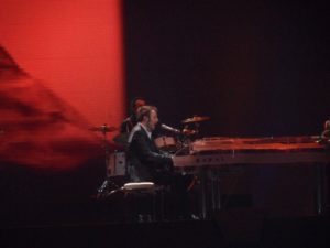 The background presents images of piano keys being played and then a large video backdrop of Raphael making the jazz vocals with the trumpet playing.