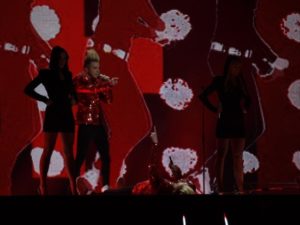And so young Eric takes to the stage with his tightly choreographed number. I personally don’t see what all the fuss is about with this song at all – it makes no impression on me, despite the dynamic performance. Eric gave it his all, shame that the glass shattering doesn’t come across so spectacular though. Can’t see Sweden making the top ten this year, though I could be wrong!