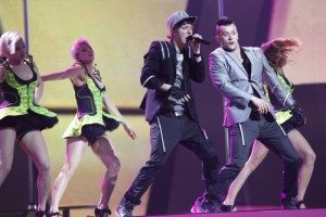 The second rehearsal saw them wearing the same costumes as in their first – the lime green and black tutu/corset creations on the three pole dancers may be interesting, but just seem to come across rather lewd and tawdry to be honest. Whether or not your average European is ready for that kind of tittilation on a Saturday night remains to be seen. It didn’t work for Dita Von Teese and Oscar De Loya for Germany in 2009 and neither for The Jet Set and Time To Party for Poland in 2007. Someone should also whisper something in the boys’ ears, as flashing led lights on their stage outfits are just so old hat – in parts it comes across extremely well, but there are also certain shots that are completely wasted, there’s just too much going on.