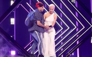 TV viewers across the world, the audience in the arena in Lisbon and everyone in the press centre – a lot of people were shocked as a stage jumper took SuRie’s microphone on stage – but none more than SuRie. She received the biggest applause from the audience for pulling through.