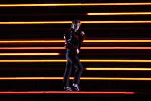 Michael, United Kingdom( from the arena) For the second year in a row Sweden bring a stage set up that takes forever to get ready. The multi coloured fluorescent lights shine like an oversized old electric fire in the middle of the stage. They’ll be hoping he gets first on in the finals. And to the finals he should go with this Bieber like number. Pulsating like a disco in the arena, no one can do Eurovision like Sweden….except Azerbaijan with Swedish people