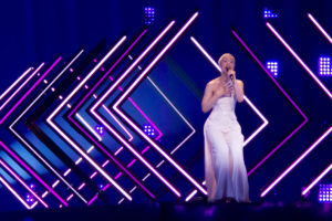 SuRie is wearing a white dress which lets different colours of light reflect on it. Mainly these are purple and pink. The song has very mellow verses and tries to burst out in the choruses. While this is sort of an anthem, SuRie just doesn’t quite manage to belt the song out, as say some of these soul divas. The laser lights in the background of the stage are mainly pale blue. There are six of them and they often change colour to lavender, while SuRie stands in front of these. It’s clear the staging has been polished up as best it can, but it needs to have more power. There is a moon like glow in the background which shines out into SuRie, but so far no signs of any Storm. The back wall is mainly dark purple.
